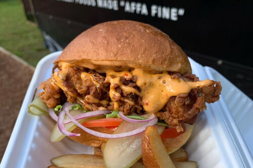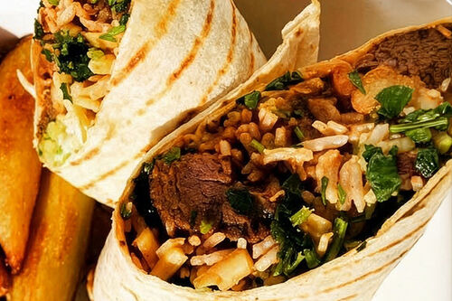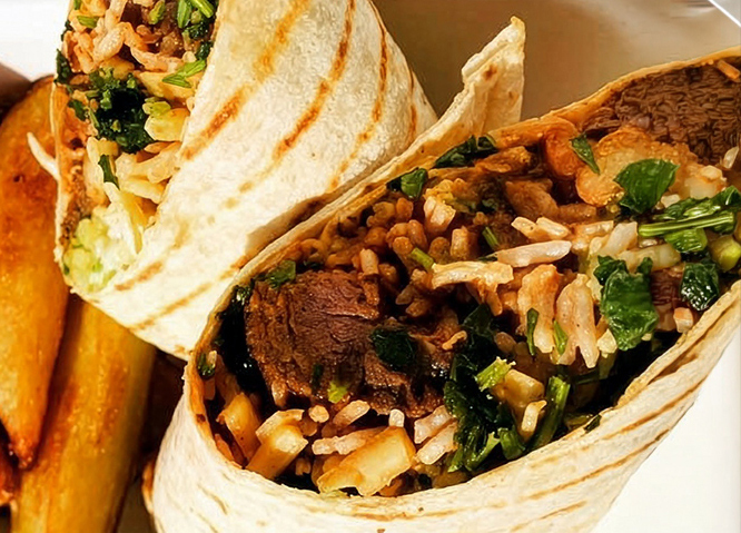 Full flavoured lightly spiced tomato sauce with confit garlic baked basmati rice, borlotti beans with freshly roasted onions and peppers, guacamole, sour cream, scottish cheddar in a tortilla wrap. (we use vegan cheese and mayonnaise). Add scotch bonnet chilli oil to spice it up.